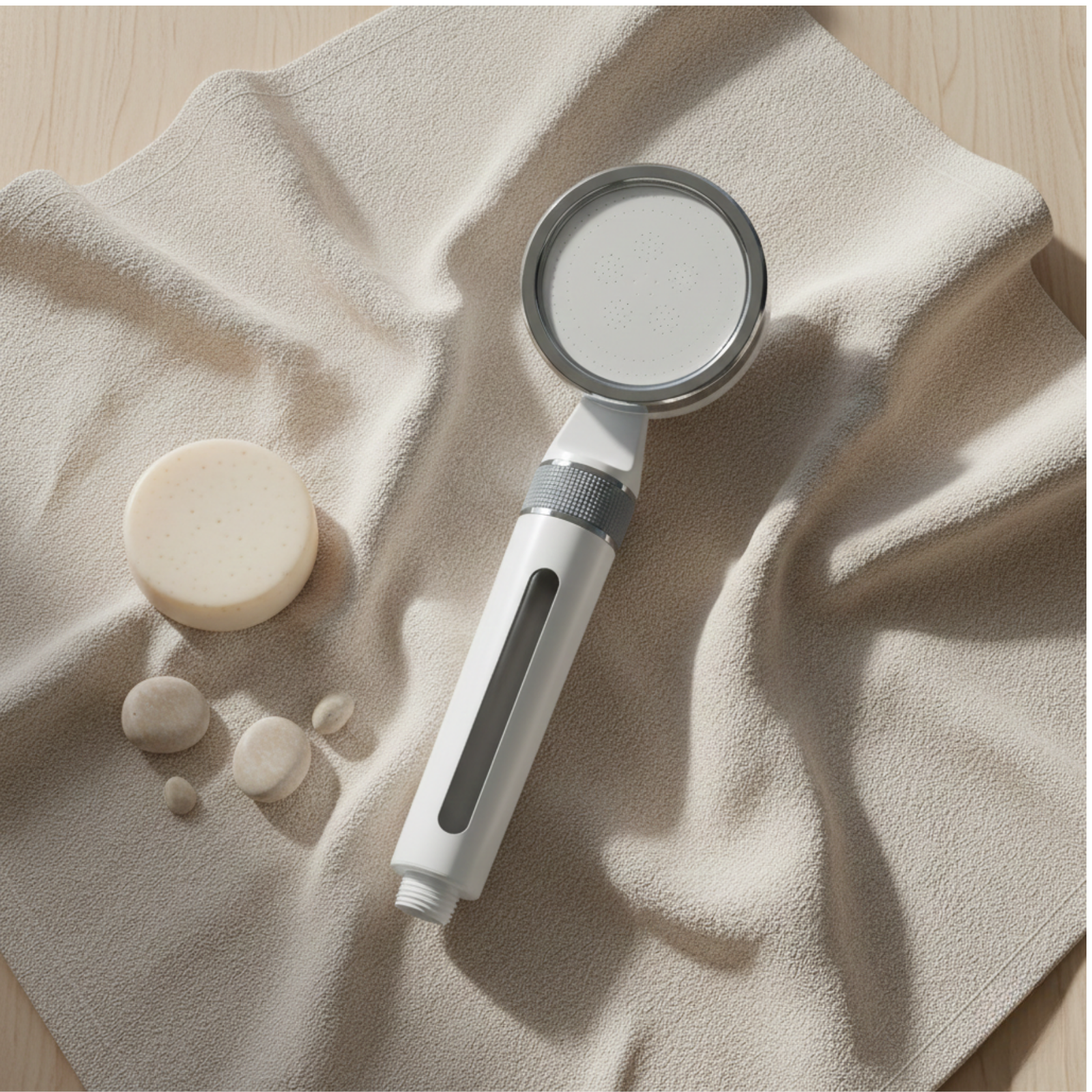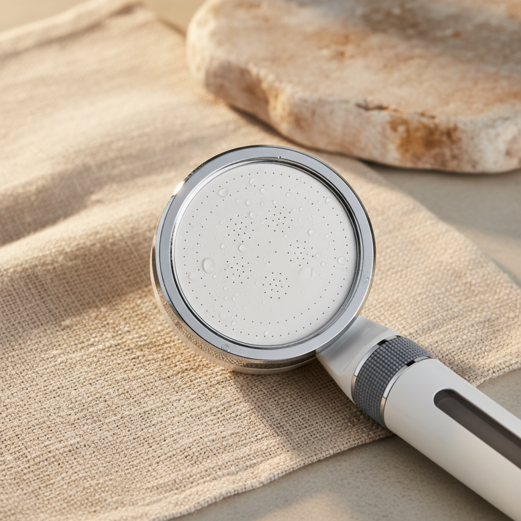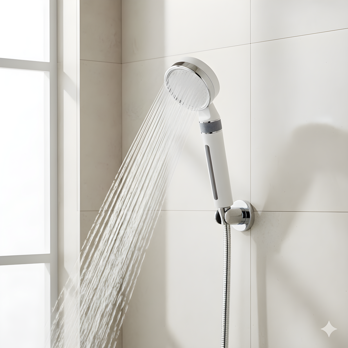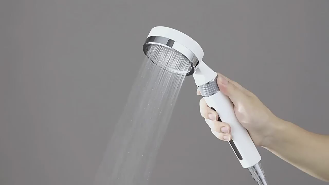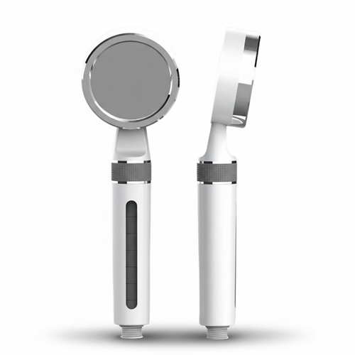 Der Duschkopf filtert das Wasser direkt beim Durchfluss. Die Kombination aus KDF55- und Aktivkohlefilter reduziert Chlor, Rückstände und Verunreinigungen, bevor das Wasser auf Haut und Haare trifft.