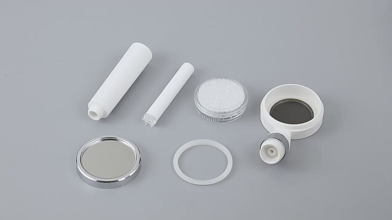 Die Kombination aus KDF55, Calcium Sulfite und Aktivkohle reduziert Chlor, Schwermetalle und Verunreinigungen – für spürbar reineres Duschwasser.